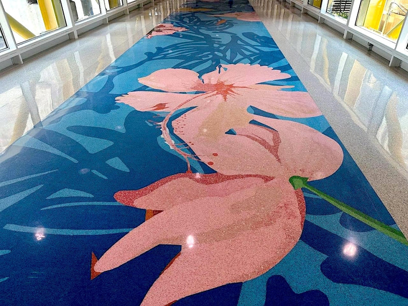 A Journey is a long terrazzo floor where branches and roots flow across a calm blue surface, dotted with bright pink flowers, green buds, and golden leaves. It invites children to follow the curves of the branches or pause within a flower, while others may simply stroll or roll along, enjoying a peaceful, river-like path. The blue evokes the sea nearby — its clear Gulf Stream waters — and symbolizes tranquility and wisdom passed through generations. The roots and branches represent the blending of cultures that shape South Florida: Latin American, Caribbean, and Native American heritages intertwined. This mosaic celebrates the diversity of our region — a reflection of the world’s rich mix of stories, connections, and shared humanity.